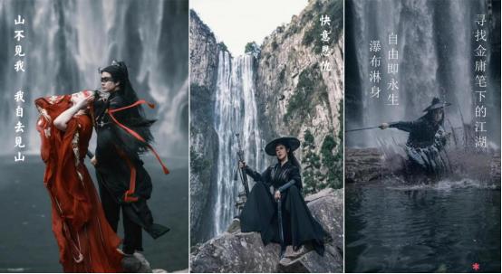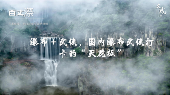 武侠大会 第二,把“话题”变“画像”。 借助媒体与网络的力量,让话题转化为精准的游客画像。我们策划了“山不见我,我自去见山”“快意恩仇”“寻找金庸笔下的江湖”等话题,甚至将瀑布水汽打造成爆点——游客被水汽淋身的“狼狈”场景,被包装为“瀑布淋身,自由即永生”的释放感。例如,500万粉丝博主拍摄的“油纸伞抛空遇水汽”视频,创下2000万播放量;各路达人解锁的网红打卡点从5个扩展至无数个,衍生出上万条原创视频。同时,我们开拓“瀑布+商业”模式,吸引杂志拍摄、化妆品测试、户外服饰测评等商业合作,美食、攻略类博主的“反差感”内容(如“脚抖却称不难走”)进一步引爆传播。